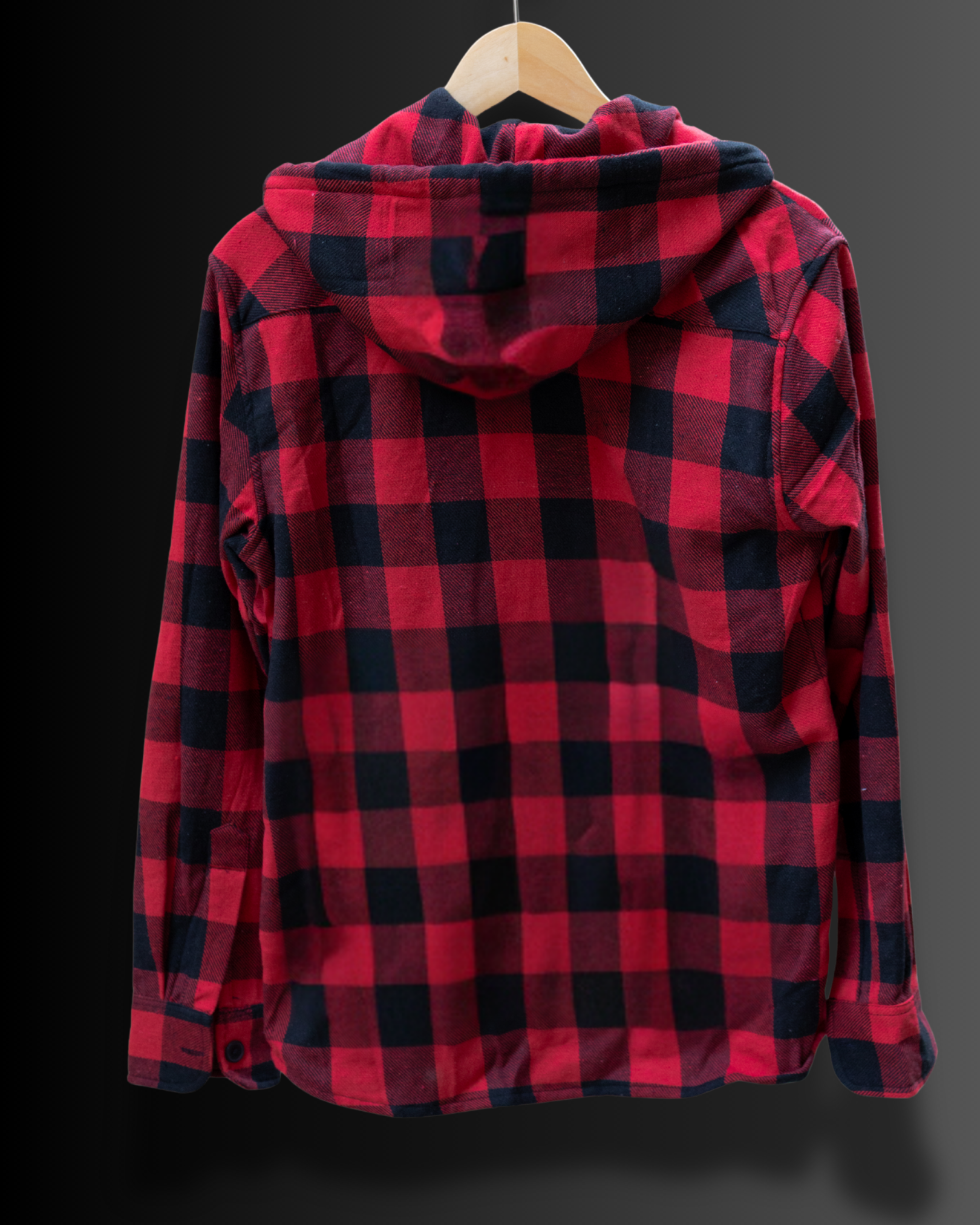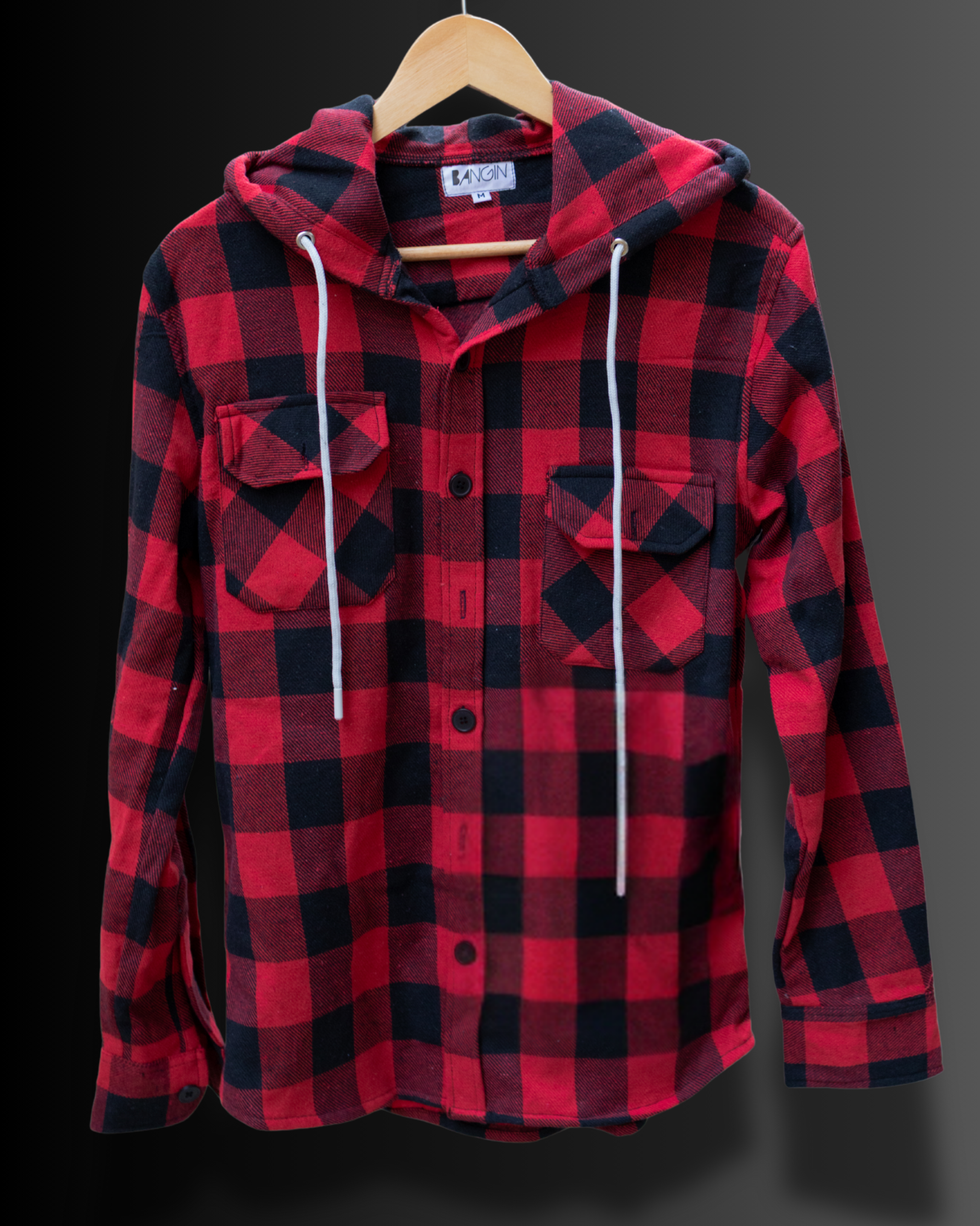 Men’s Long Sleeves Flannel Shirt with a hoodie and drawstrings. .